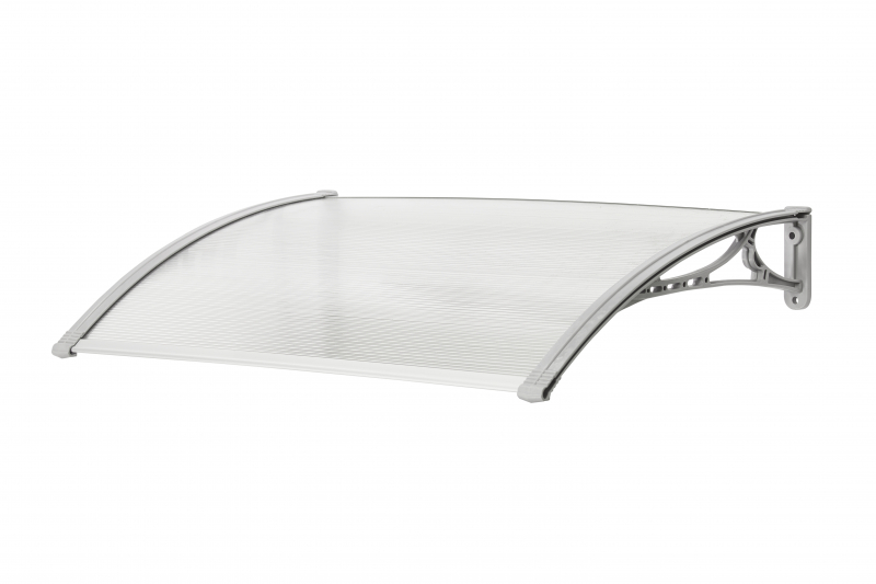 SUPERROOF Baldachin Modell RIO 1000 in gebogenem Design. Schützt Ihren Eingang vor Regen, Schnee und Hagel. Halterungen aus schlagfestem und windabweisendem Kunststoff ( grau ). Wetterbeständigkeit: nicht durch Änderungen der Außentemperatur verformt. Aluminiumverkleidungen vorne und hinten der ultra-dauernswerten 2 mm. transparente UV-stabilisierte 2-Schicht-Polycarbonatfolie. Hohe Lichtdurchlässigkeit. Schneelast: 97,5 kg pro m2. 5 Jahre Wetterbeständigkeit Garantie auf das Polycarbonat. Schnell und einfach zu montieren. Bei Bedarf kann es durch Einfügen zusätzlicher Sätze erweitert werden. Schrauben zur Wandbefestigung in Ziegeln enthalten. Abmessungen: 1000 x 600 ( Länge x Tiefe ). Einbauhöhe über der Tür: 280 mm.