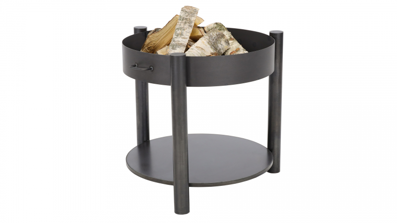 Elegante und solide Feuerstelle von Greenhand mit Stauraum. Stahl mit schwarzer, kraftbeschichteter Oberfläche, die im Laufe der Zeit eine rostige Patina annimmt. Ø80 cm. Höhe 84 cm. Gewicht 33 kg. Kommt zusammengebaut.