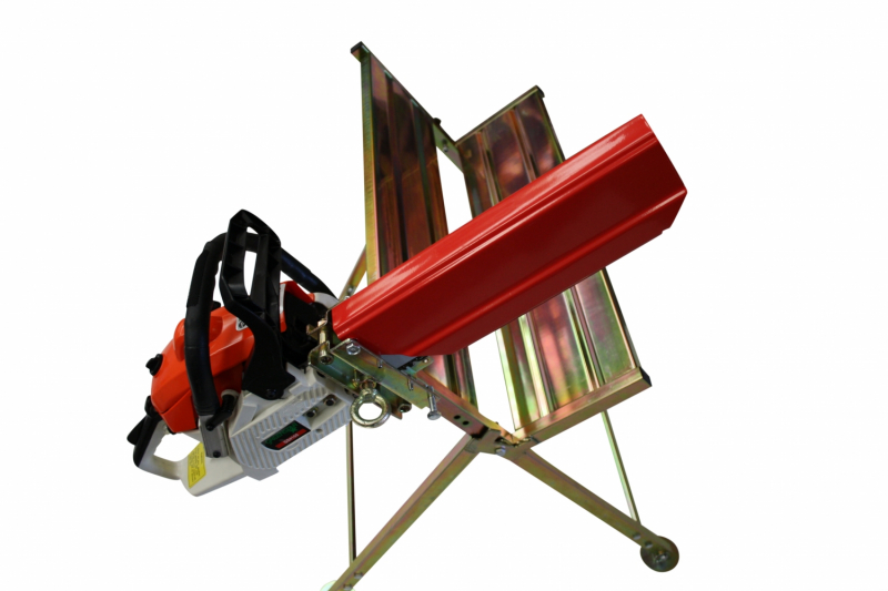 Sägebock zum Absägen von Brennholz, bei welchem die Motorsäge am Metallsägebock sicher montiert ist. Die Motorsäge kann während des Sägens im Sicherheitsschild auf- und abgeschwenkt werden. Dimension: 880x710x960 mm. Unmontiert.