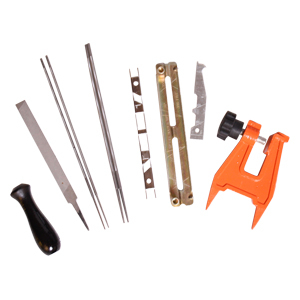 Das Set beinhaltet flache/runde Feilen für 4,8mm-Ketten und 4mm-Ketten. Griff für die Feilen, Schleifhalter und Schraubzwingenhalterung. Wird im Kanevas-Beutel mit Verschluss geliefert.